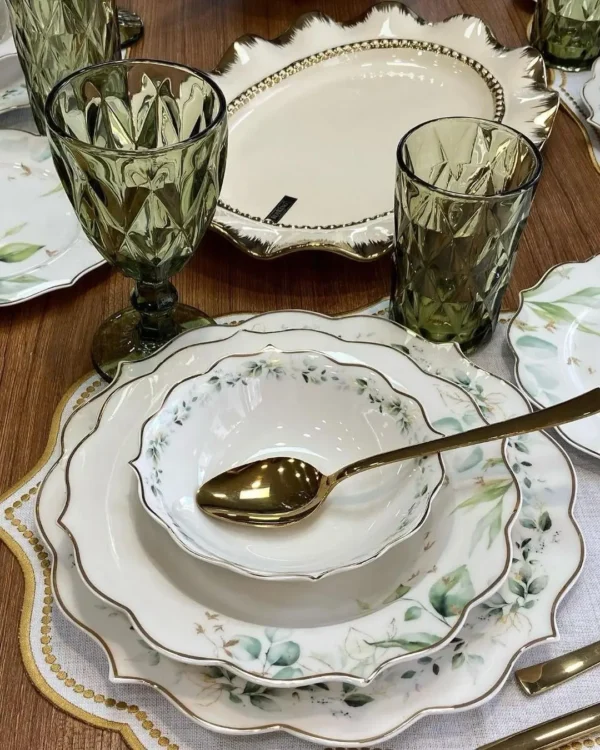 این سرویس چینی 6 نفره از جنس چینی بونچاینا با کیفیت بالا ساخته شده است که مقاومت بالایی در برابر ضربه و حرارت دارد. همچنین، دکور ظروف با طلای ناب انجام شده که زیبایی و ارزش آنها را دوچندان کرده است. طرح و نقش زیبای گلهای سبز بر روی ظروف، حس طراوت و شادابی را به محیط آشپزخانه شما میآورد.